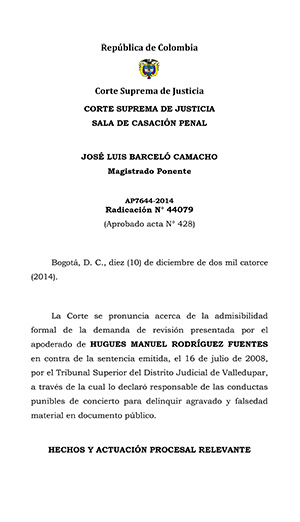 Ya Hugues se había entregado ante la justicia estadounidense, pero siguió la pelea y presentó (por medio de su representante en Colombia) una demanda de revisión a la Corte Suprema de Justicia y expuso nuevas pruebas: una indagatoria del mismo acusado, dos declaraciones de ‘Tolemaida’ y un informe de la Fiscalía que indica que Rodríguez no hizo parte del organigrama de las Auc.