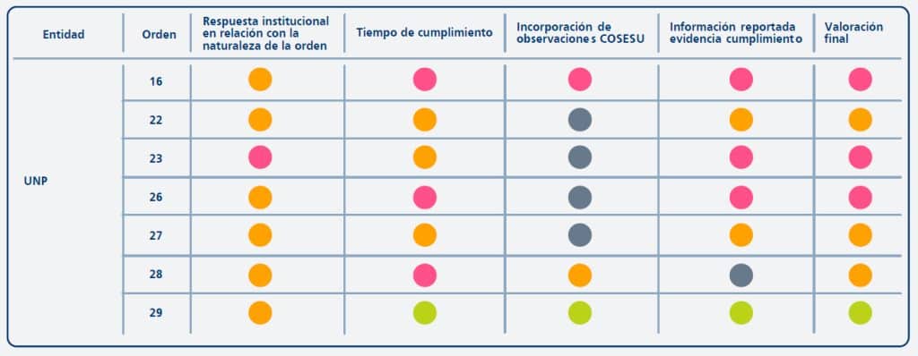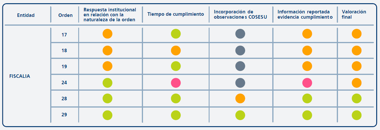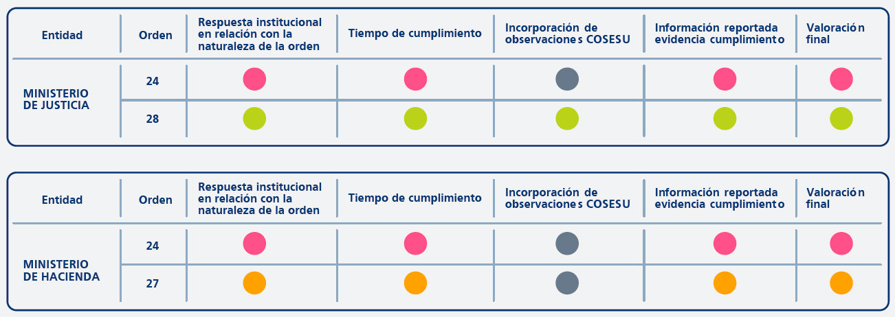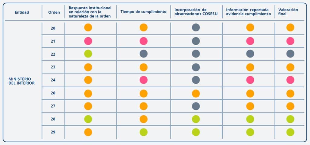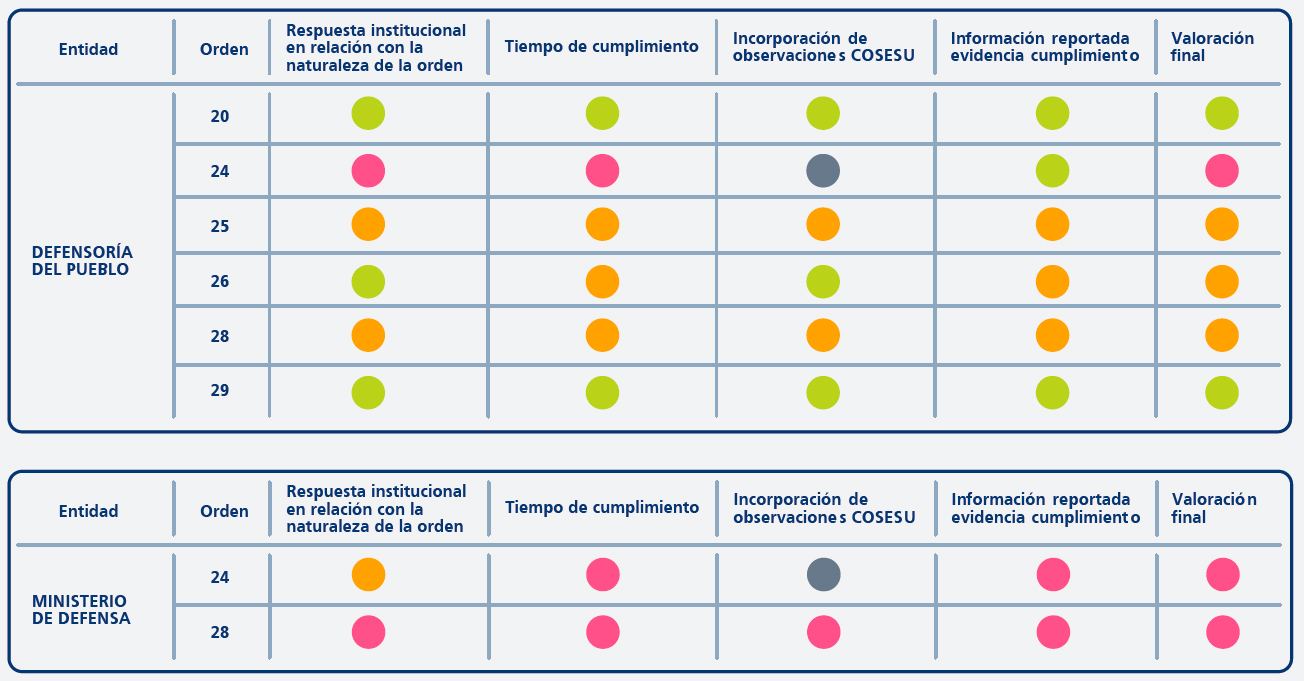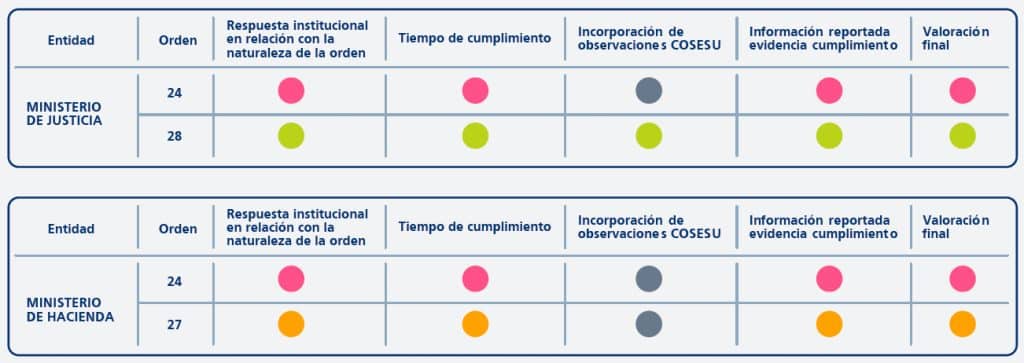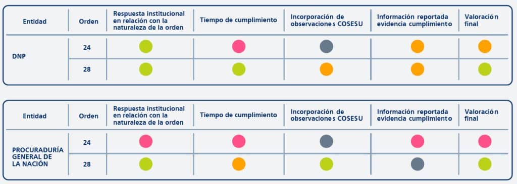 Para evaluar el rol de cada entidad, la Cosesu creó un mecanismo de semaforización, teniendo en cuenta el grado de cumplimiento de la respuesta institucional en relación con la naturaleza de la orden de la Corte; el tiempo en que fue ejecutada; la incorporación de sus propias observaciones; y la existencia de posibles deficiencias en la información reportada.