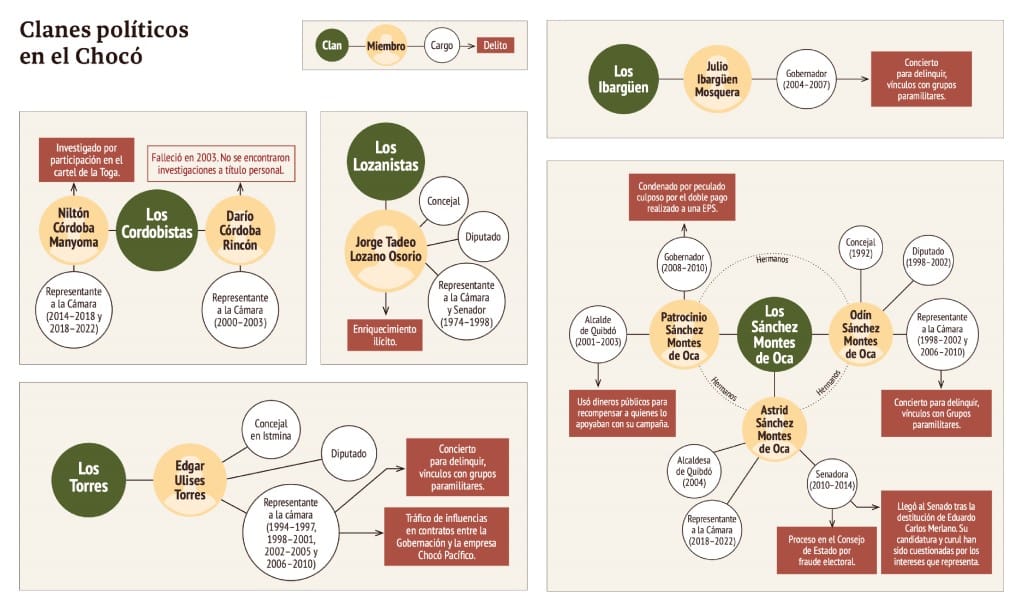 A raíz de eso, entre 2010 y 2011, el departamento tuvo cuatro gobernadores. El poder de la familia Sánchez Montes de Oca es ampliamente reconocido en Chocó y los escándalos no solo se han quedado en corrupción.