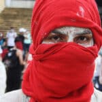 Rostros cubiertos por ese rojo sangre que ha teñido las calles de diversas ciudades del país en medio de las jornadas de protesta y ojos que interpelan a quien los mira. Foto: Juan Diego Restrepo E.