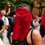 Los rostros cubiertos con velos rojos, otra de las expresiones de dolor expuestas en las calles de Medellín. Foto: Juan Diego Restrepo E.