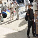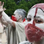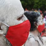 El contraste del blanco de la arcilla con el rojo del tapabocas creó una imagen de dolor para quienes desde afuera observaron la puesta en escena de la marcha convocada por los artistas. Foto: Juan Diego Restrepo E.