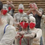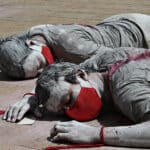El performance propuesto por los artistas en Medellín expuso una visión del dolor a partir de dos elementos: cuerpos bañados en arcilla y tapabocas rojos. Se pretendía representar la vida y la muerte en un país que ha visto caer a sus jóvenes en las calles a manos de la represión policial. Foto: Juan Diego Restrepo E.
