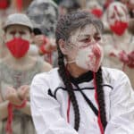 La sangre fue el otro componente del performance propuesto por los artistas en Medellín durante la nueva jornada de protesta nacional. Seres emergiendo de la arcilla, golpeados y violentados. Foto: Juan Diego Restrepo E.