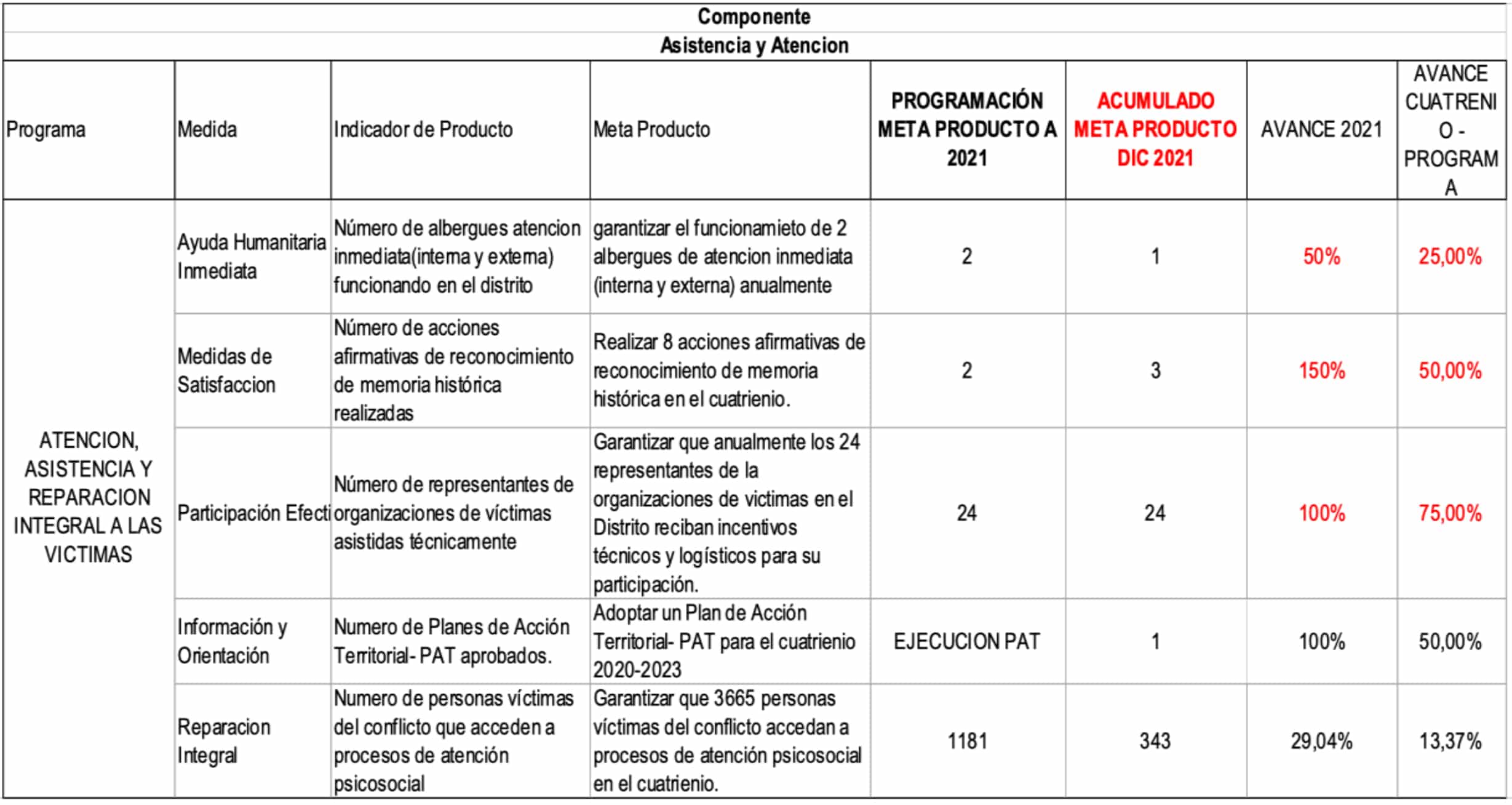 Son estas entidades, en conjunto con la Unidad de Atención de Víctimas a nivel nacional, las que deben de coordinar los Puntos de Atención a Víctimas o los Centros Regionales de Atención a Víctimas, en los que brindan servicios de atención y orientación jurídica, psicosocial, ayudas humanitarias y acceso a oferta institucional, entre otras. A pesar de estas disposiciones, los programas de atención y reparación a las víctimas no han logrado su cometido.