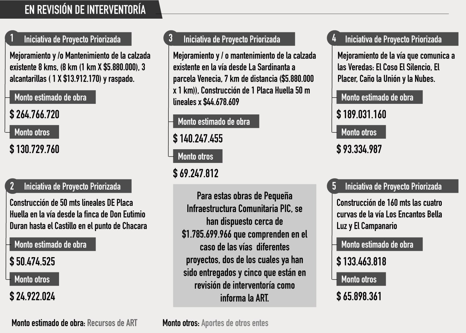 . Se destinó una interventoría con un valor de $99.741.659 y para cuyo fin se suscribió un convenio entre la ART y la Alcaldía de La Paz que ya se encuentra finalizado y del cual el Consorcio Vías de La Paz fue el ejecutor.
