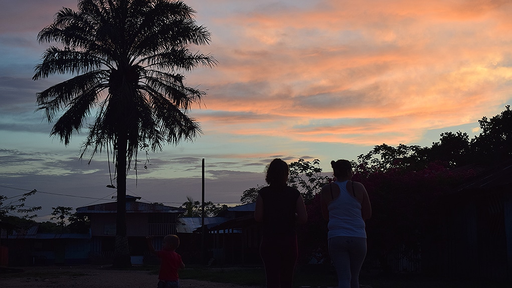 Las tres calles de la vereda Nueva Colombia enseñan la tierra rojiza de la selva amazónica mientras la mayoría de sus habitantes se resguardan bajo alguna sombra.