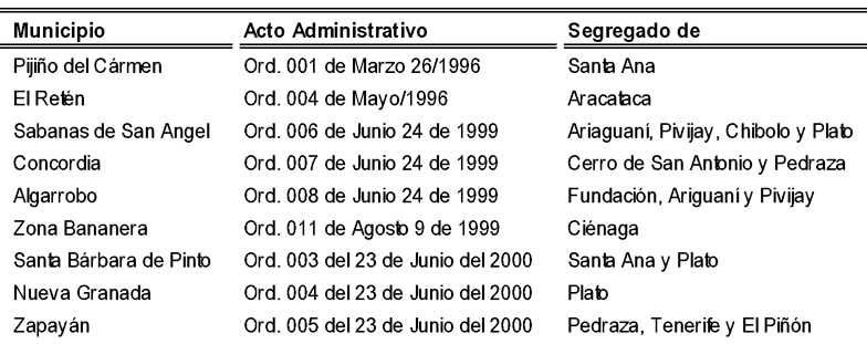 Estos son los pactos de Chibolo, Ralito, El Difícil y Pivijay. (Leer más en: Lo que la Costa perdió) La participación de los denominados terceros en el conflicto armado es otro punto importante sobre el que el informe llamada la atención: “Para las élites políticas y económicas, la alianza con el paramilitarismo era una forma que desde la ilegalidad les facilitaría la posibilidad de mantener y expandir sus riquezas y poder, además de tener condiciones de seguridad para sus negocios”. (Leer más en: Ocho puntos para entender la guerra en Magdalena) La investigación va más allá con su análisis, y señala que esas alianzas tenían un afán de reconfiguración territorial, que se evidencia en la creación de nueve municipios entre los años 1999 y 2000: Pijiño del Carmen, El Retén, Sabanas de San Ángel, Concordia, Algarrobo, Zona Bananera, Santa Bárbara de Pinto, Nueva Granada y Zapayán.