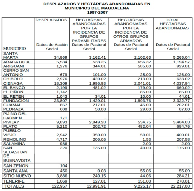El informe reseña ocho casos de desplazamiento forzado y despojo de tierras que dan cuenta del accionar del Bloque Norte, ocurridos en los municipios de Chibolo, Plato, Sabanas de San Ángel, Remolino, Salamina y Aracataca.