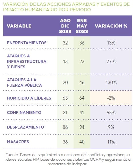 Por otro lado, en cuanto a resultados, la valoración de la FIP no es muy positiva, a pesar de la reducción de acciones contra la Fuerza Pública, ataques a la infraestructura, asesinatos de líderes sociales, desplazamientos y masacres, al comparar los indicadores del primer semestre de 2022 con los de 2023, porque esos “descensos tienen múltiples causas y no pueden ser atribuidos exclusivamente a los ceses al fuego por varias razones”.