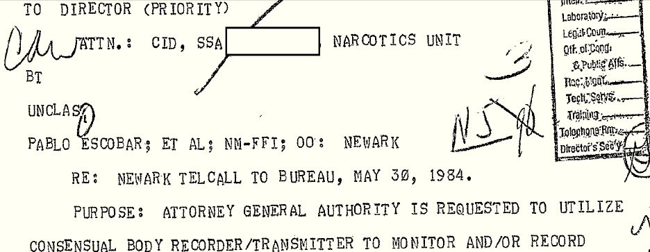 Para saber más sobre Escobar, agentes del FBI con sede en Newark, pidieron una autorización a sus superiores con el fin de desplegar una investigación que incluía interceptaciones telefónicas y agentes encubiertos que se harían pasar por vendedores de drogas o por hombres dispuestos a lavar dinero para Escobar.