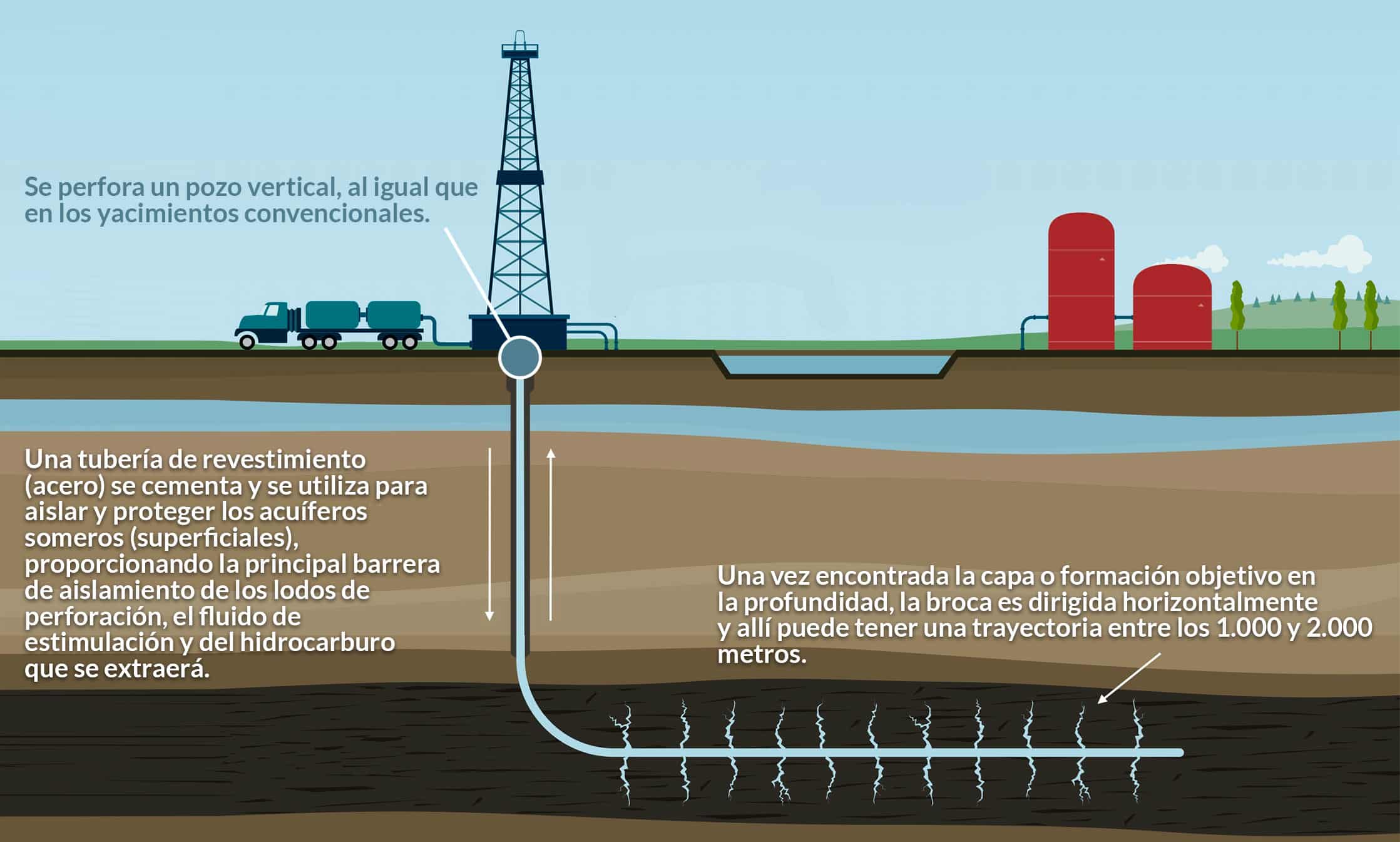 cifras de la Agencia Nacional de Hidrocarburos (ANH). Sin embargo, estudios de Ecopetrol de 2011 evidencian que en el llamado Valle del Magdalena Medio –donde se encuentra San Martín- los análisis de geología, geofísica e ingeniería de yacimientos estiman que hay un potencial de entre 2.400 millones y 7.400 millones de barriles de petróleo y gas técnicamente recuperables. El problema es que estos hidrocarburos aún se encuentran en lo que se conoce como roca generadora. Es decir, en una formación geológica de poca permeabilidad que almacena crudo y gas a profundidades superiores a los tres mil y cuatro mil metros. Por esta razón, este tipo de yacimientos recibe el nombre de “no convencionales” y su explotación solo es posible mediante una tecnología llamada ‘fracking’. Dicha tecnología, que comenzó a ser usada en Estados Unidos en 1999, tiene como punto de partida el fracturamiento hidráulico, que consiste en la inyección, a muy alta presión, de ingentes cantidades agua mezclada con arena y químicos, que generan microfisuras en las rocas generadoras para permitir que el crudo –o el gas- ascienda a la superficie. Como lo explica Óscar Vanegas, profesor de geopolítica energética de la Universidad Autónoma de Bucaramanga, aunque el fracturamiento hidráulico se venía realizando desde los años 50 del siglo XX, el fracking solo fue posible cuando apareció maquinaria altamente especializada como taladros “Top Drive” y los llamados ‘motores de fondo’, que permitieron perforar la roca de manera horizontal y no vertical, como venía trabajando la industria petrolera desde hace un siglo.