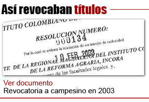 Entre febrero y marzo de 2003, el Incora revocó la adjudicación de 134 predios, dos en promedio por día, argumentando que los campesinos abandonaron la tierra o incumplieron con el pago de un crédito que les otorgaron quince años atrás.