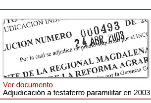 28 de marzo de 2011VerdadAbierta.com documenta, como nunca antes se había hecho, cómo el Instituto de la Reforma Agraria se prestó para que ‘Jorge 40’ y sus amigotes pudieran legalizar miles de hectáreas de tierras usurpadas a la fuerza a campesinos pobres en el Magdalena.
