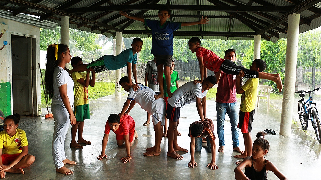 A su alrededor gravitan por lo menos 30 niños y niñas que hacen parte del semillero y de las actividades del circo que dirige; además, coordina un grupo de 20 jóvenes, quienes, además de participar de actividades formativas y recreativas, son los que se encargan de cuidar el centro donde se reúnen con frecuencia. “Esta casa fue construida por los miembros de la comunidad gracias a un proyecto financiado por Benposta, Diakonia y Misereor (organizaciones sueca y alemana, respectivamente).