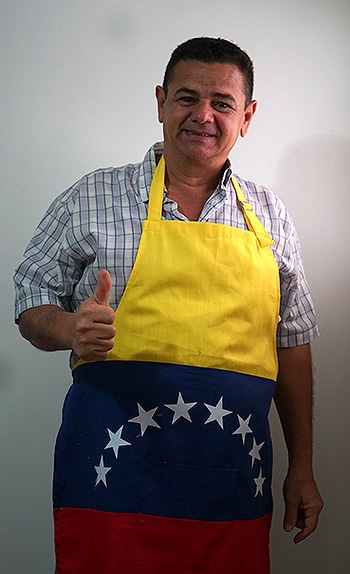 Volvió mucho antes de la crisis venezolana. — Hay un dilema: ¿de dónde es la arepa, de Colombia o de Venezuela? Solo te digo que nosotros la preparamos de una forma increíble —dice Edixon mientras se coloca un delantal con la bandera de su país y añade entre risas que si las arepas le quedan feas, sólo se da vuelta al delantal para dar cuenta de su procedencia, dejando así expuesta la bandera de Colombia. Lucy Sánchez es la esposa de Edixon.