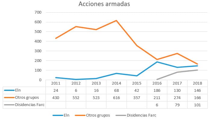 Sin embargo, indica un paulatino descenso de los hechos atribuibles a otros actores armados desde 2015, mientras que registra un constante aumento de los hechos cometidos por disidencias de las Farc a partir de 2016.