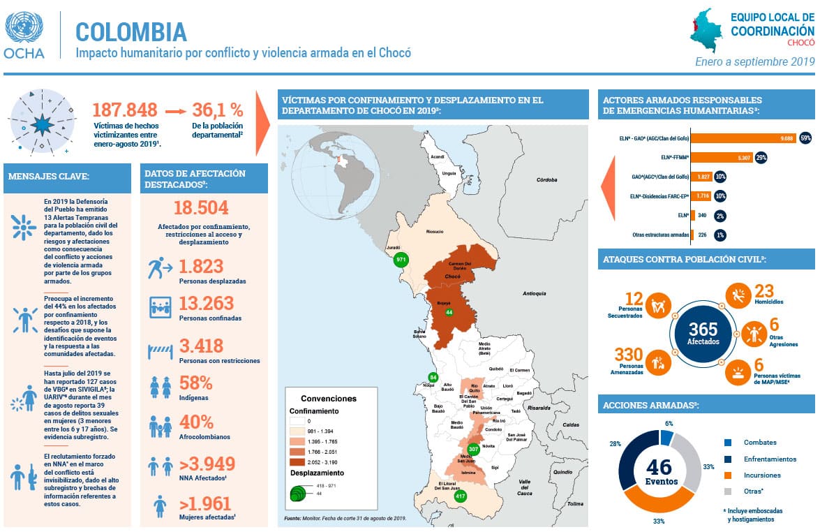 De acuerdo con cifras de Oficina de Naciones Unidas para la Coordinación de Asuntos Humanitarios (OCHA), entre enero y septiembre de este año, 13.263 personas han sido afectadas por el confinamiento en diversas regiones de Chocó, lo que significa, según esta agencia, un incremento del 44% de las víctimas con respecto a 2018.