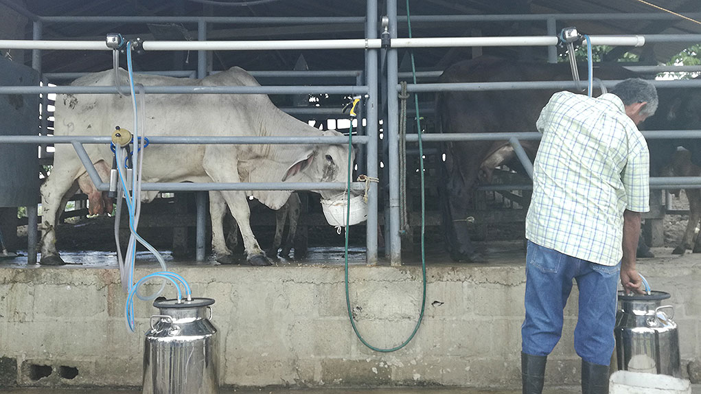Para hacer productivas las tierras, fue clave la construcciónd de cuatro jagüeyes, que mediante un sistema de riego, por gravedad, mantienen la fertilidad de 35 predios. “Acá tenemos 16 salas de ordeño, 15 de ellas mecánicas.