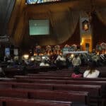 Ofrendas florales, velas encendidas y mucha espiritualidad se vivió en el atrio del templo Los Dolores, en el norte de la ciudad de Quito, durante la capilla ardiente en la que se velaron los cuerpos de Javier, Paul y Efraín. Foto: Juan Diego Restrepo E.