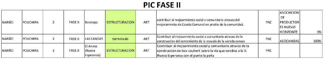 Buscando dar cumplimiento a los objetivos de la primera y la segunda fase del PDET, la ART ha entregado recursos a sus aliados, la FNC y 450 millones de pesos al Programa de las Naciones Unidas para el Desarrollo (PNUD), para llevar a cabo obras del programa de Pequeñas Iniciativas Comunitarias (PIC), que son contratadas con las comunidades para que ellas mismas las ejecuten y a la par obtengan ingresos que aporten al desarrollo local.