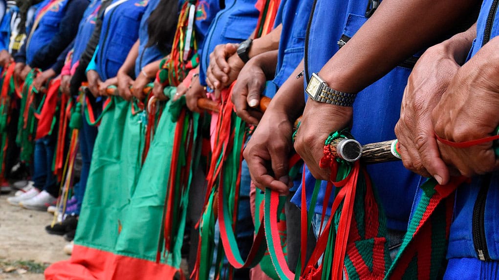 “No es una guardia armada, es cívica. Sus prácticas de defensa personal se dan con la esgrima de bolillo (chonta)”, explica Roxana. “Se reactiva a partir de que los territorios sentimos la necesidad de tener un modelo de seguridad propio, que permita hacerle un acompañamiento cívico a nuestros líderes y a nuestros territorios”.