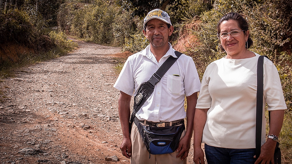 Foto: Co.marca digital. Luz Marina Sánchez y Manuel Antonio Miranda, integrantes de la JAC de la vereda Crucero del Obelisco, agradecieron la inversión, pues una vez terminaron las obras mejoró considerablemente el tránsito, pero no olvidan que les quedaron debiendo una alcantarilla en un sitio estratégico y que aún faltan tramos que se deben mejorar.