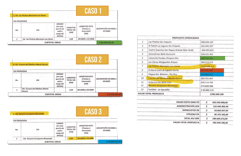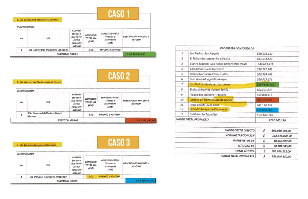 Por ejemplo, cuando se discrimina el subtotal del tipo de obra que se hará en el tramo Las Piedras-Manizales-Los Llanos, es de 60 millones 534 mil 445 pesos, mientras que en la propuesta consolidada aparecen 107 millones 838 mil 713 pesos.