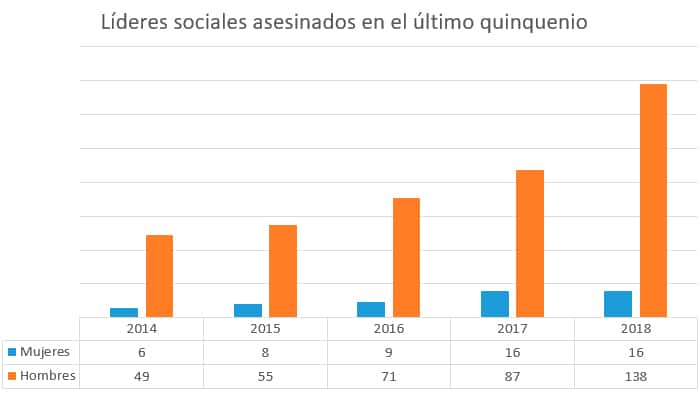 De acuerdo con los registros del Programa Somos Defensores, que desde 2002 documenta toda clase de agresiones contra líderes sociales, en el último quinquenio los asesinatos de lideresas han aumentado constantemente.
