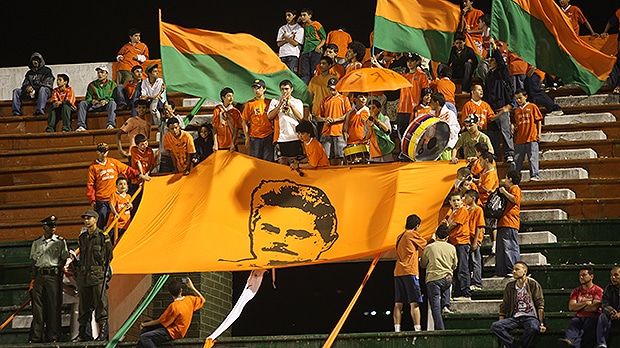 Rostro de Gustavo Upegui estampado en una bandera de la barra del Envigado Fútbol Club.
