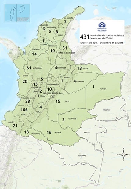 Asimismo, alertó que el suroccidente sigue siendo la región más golpeada por esa ola de violencia, ya que los asesinatos en Putumayo, Nariño, Cauca, Valle del Cauca y Chocó, pasaron de 45 a 64, entre 2017 y 2018.