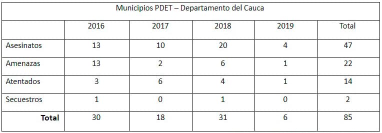 En este periodo, no se reporta ningún homicidio en Florida y Pradera, también municipios de este mismo PDET, pero ubicados en Valle del Cauca; y sólo se registra un caso de amenaza contra una líder indígena en diciembre del año pasado.