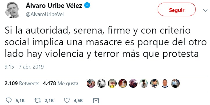 El pasado 7 de abril, desde su cuenta en la red social Twitter, Álvaro Uribe Vélez, expresidente de la República (2002-2010) y jefe del Centro Democrático, el actual partido de gobierno, una vez levantada la minga, emitió un controvertido mensaje que fue considerado por diferentes sectores como instigador a la violencia contra quienes acudan a la protesta social.