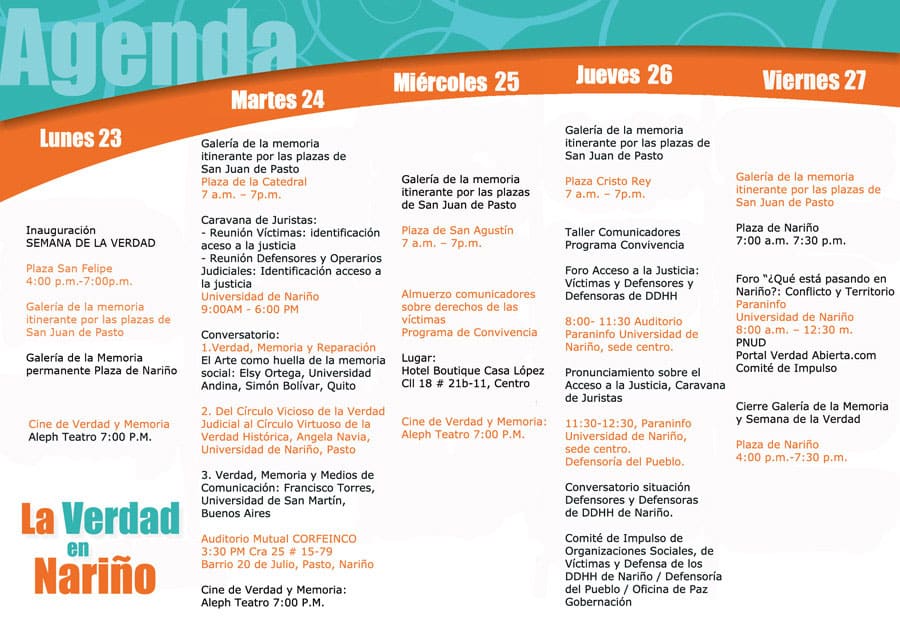 En Nariño, la realización de la Semana de la Verdad recibe el apoyo de las organizaciones participantes en el Comité de Impulso de Organizaciones de Derechos Humanos y Víctimas de Nariño, el Fondo Mixto de Cultura, la Fundación Desarrollo y Paz – Fundepaz-, Fundación Aleph Teatro y otras organizaciones locales.