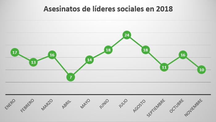 Al parecer, los finales y comienzos de año son los periodos más críticos en cuanto a los riesgos de comisión de violaciones al derecho a la vida contra líderes y defensores(as) de derechos humanos; esto puede deberse a que en esas épocas el país se encuentra distraído por las festividades decembrinas y las vacaciones”.