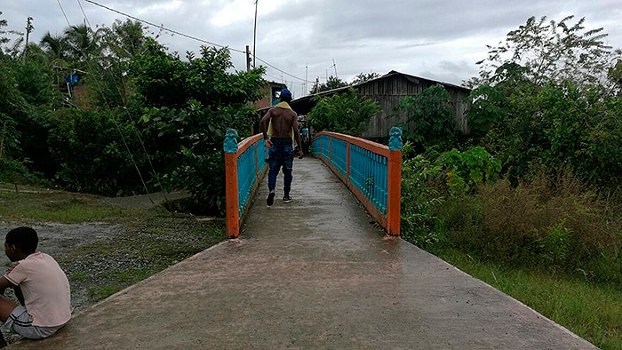Navegar este afluente desde Istmina, para llegar al caserío, revela un pasado de explotación depredadora: lo primero que se observa es el esqueleto de un ‘dragón’ de Chocó Pacífico, la empresa estadounidense que durante el siglo XX arrancaba a chupetazos el oro a las comunidades afro de estas cuencas.