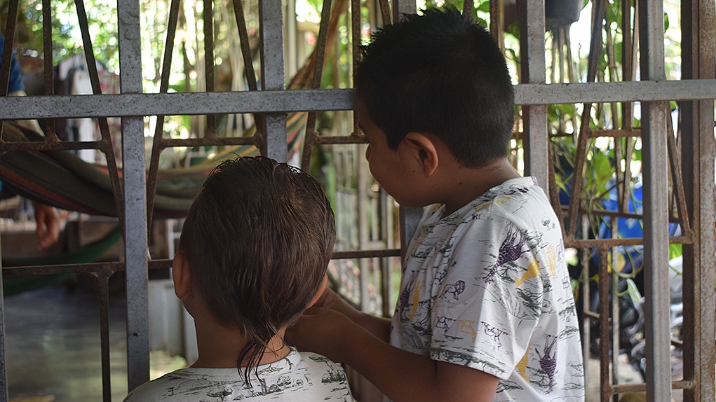 Adentro de una casa de rejas blancas que dan contra una calle destapada en el municipio de San José de Guaviare, hay dos niños vestidos de manera idéntica: pantalón amarillo recogido hasta la rodilla y camiseta con pintas de animales de safari africano.