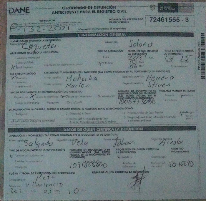Certificado de Defunción entregado con el cuerpo de Marlon Mahecha a la familia.