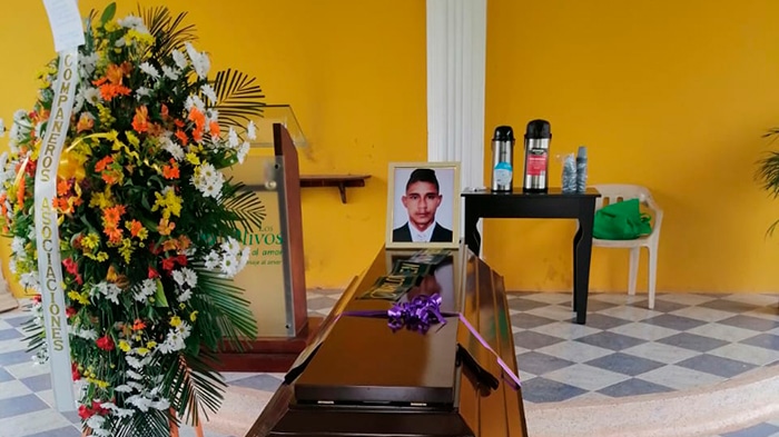 Este fue lo más cercano que la familia Mahecha tuvo a un velorio. “El cajón totalmente sellado y lo que hicimos fue poner una foto de él ahí encima del cajón”, recuerda su madre.