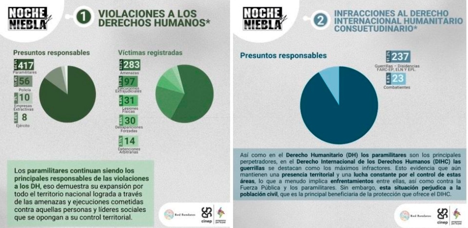Respecto a las violaciones del Derecho Internacional Humanitario, el centro de investigación señaló al Ejército de Liberación Nacional (ELN), las disidencias de las Farc y el Ejército Popular de Liberación (EPL) como los principales presuntos responsables.