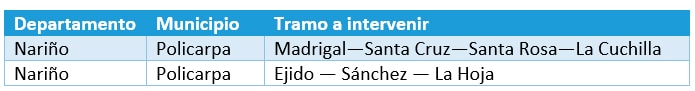 El primero de ellos es un convenio interadministrativo celebrado entre la ART y la alcaldía de Policarpa por un valor de $881’936.567. (Descargar Convenio interadministrativo SC 0017-17) Dicha suma será aportada por la entidad nacional para implementar el proyecto de Red de Vías Terciarias para la Paz y el Postconflicto en el municipio en los siguientes tramos: