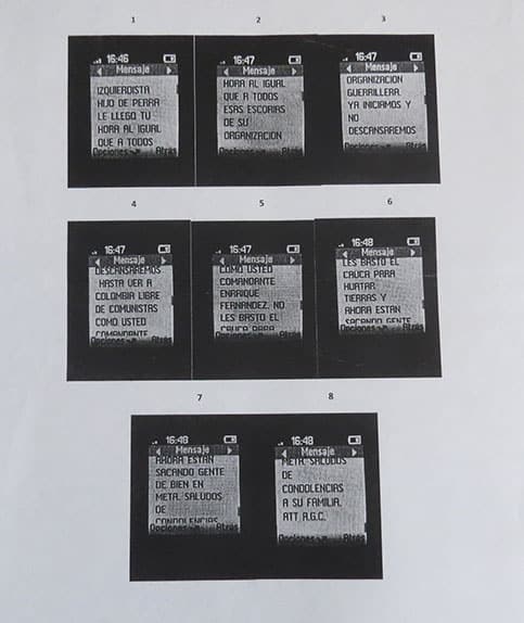 El pasado 15 de abril, cuando se aprestaban a conmemorar el primer aniversario de la muerte del gobernador Acosta, a la sede del resguardo en Timbío llegó un panfleto a nombre de las Agc en el que amenazaron de muerte a varios dirigentes. “Los tenemos en la mira, apenas dejen esos palitos (bastones de mando) que no les sirven para nada, ya saben dónde quedan: así como su querido e idolatrado Gerson Acosta”, señala uno de los apartes de la amenaza. (Ver panfleto) Sobre las amenazas que circulan a nombre de las Agc, esa organización ha señalado en varias ocasiones que su nombre está siendo suplantado y que no están amenazando liderazgos sociales.