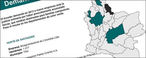 En 2013, el Incoder había presentado ante la justicia ordinaria nueve demandas contra personas y empresas que acumularon baldíos en Antioquia, Magdalena y Norte de Santander (ver mapa 2).