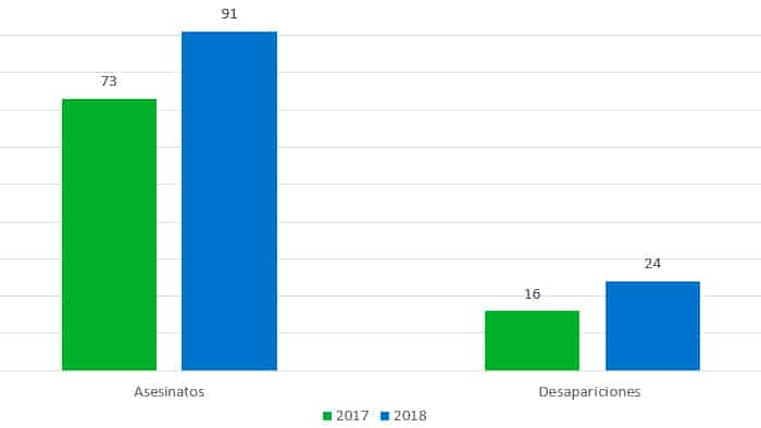 En cuanto a casos de violencia, el documento registra 133 casos de desplazamiento forzado en 2018 y ocho asesinatos, contra los seis que ocurrieron en 2017.