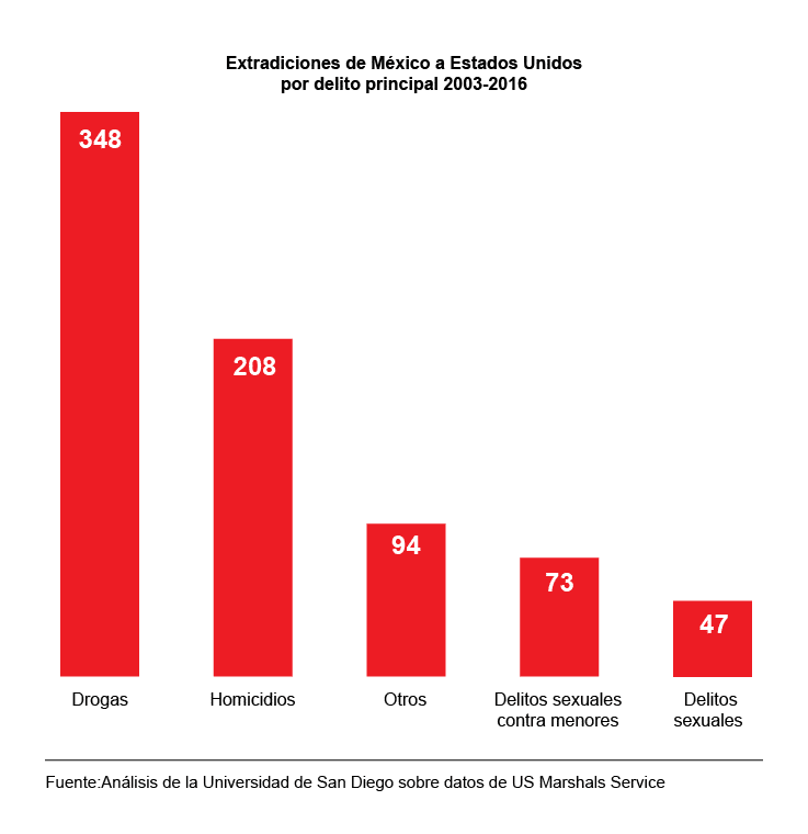 Los datos de la agencia que fueron compilados por la Universidad de San Diego muestran que hubo 770 extradiciones de México a Estados Unidos entre 2003 y 2016, casi la mitad relacionadas con narcóticos.